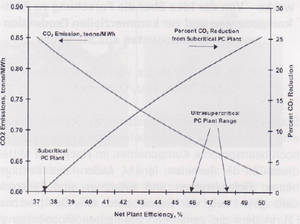In Bild 2 ist die CO2- Emission über dem Wirkungsgrad aufgetragen. Bei einer Wirkungsgradsteigerung von 37 auf 47% kann der CO -Ausstoß um 22% reduziert werden. Dies würde als Referenz bei einem 750 MW Kraftwerk 700.000 Tonnen C02/Jahr entsprechen. Im Zuge der Entwicklung immer höherer Wirkungsgrade der Kraftwerke werden die Dampfparameter kritischer [USC (Ultra Super Critical) Kraftwerke] und die Werkstoffe müssen im Hinblick auf ihre Kriechbeständigkeit permanent verbessert werden.