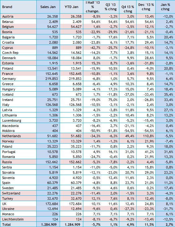 In the table below, all European countries including sales for car passengers and light commercial vehicles (in red the country with year-on-year loss in January 2014):