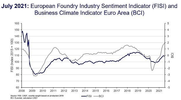 The FISI – European Foundry Industry Sentiment Indicator – is the earliest available composite indicator providing information on the European foundry industry performance. It is published by CAEF the European Foundry Association every month and is based on survey responses of the European foundry industry. The CAEF members are asked to give their assessment of the current business situation in the foundry sector and their expectations for the next six months. The BCI – Business Climate Indicator – is an indicator published by the European Commission. The BCI evaluates development conditions of the manufacturing sector in the euro area every month and uses five balances of opinion from industry survey: production trends, order books, export order books, stocks and production expectations. Please find the chart enclosed or combined with additional information at www.caef.eu