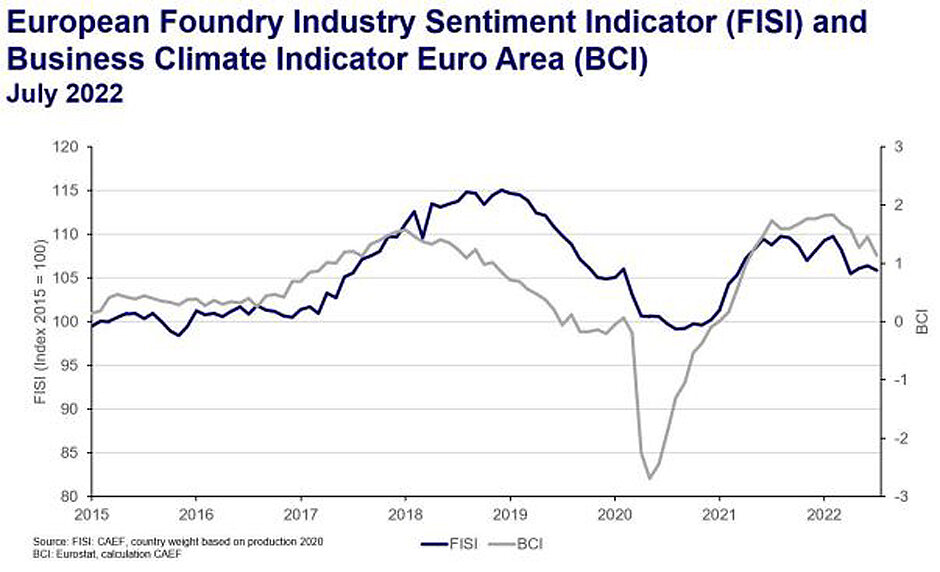 The FISI – European Foundry Industry Sentiment Indicator – is the earliest available composite indicator providing information on the European foundry industry performance. It is published by CAEF the European Foundry Association every month and is based on survey responses of the European foundry industry. The CAEF members are asked to give their assessment of the current business situation in the foundry sector and their expectations for the next six months.