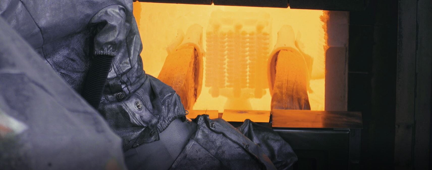 Nach dem Startsignal durch den Mitarbeiter an der Anlage, greift der erste Roboter nach dem Tiegel mit der heißen Schmelze, auf dem der zweite Roboter die ca. 900 - 1150 °C heiße Schale platziert. Im Anschluss drehen beide Roboter synchron den Tiegel und die Schale, sodass die ca. 1600 °C heiße Schmelze in die Schale läuft. „Die Koordination und aufeinander abgestimmte, synchrone Bewegung zweier Roboter im Gussprozess stellte eine besondere Herausforderung dar“, so Jedrysiak. „Die entwickelte Fertigungszelle ist ein Vorreiter für neue Maschinentechnologien im Gussprozess.“ Diese wurde über Jahre hinweg in Zusammenarbeit zwischen den Abteilungen Gusstechnik und der firmeneigenen