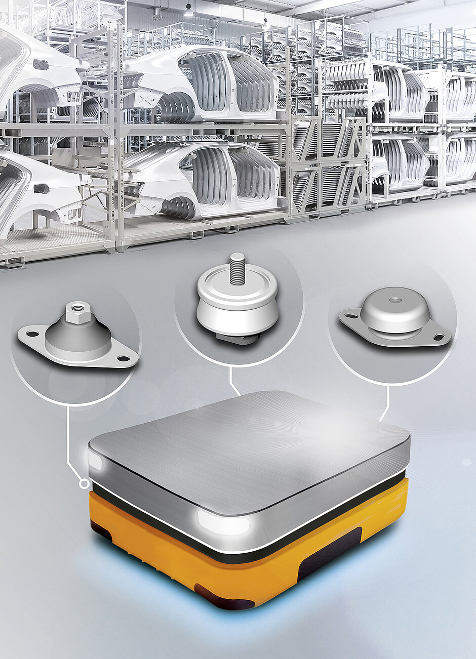 Digitalization, automation and robot technology are gaining ground in intralogistics as well. In the factories and logistics centers of the future, intelligent, autonomous systems will take on the task of transporting products between the different work steps, right through to final storage. The predominant trend is toward self-driving platforms that, for example, replenish production robots and machines at the right time and move independently around the area. They therefore fulfill crucial criteria of modern intralogistics. They ensure fast response times in flows of materials and goods, and, at the same time, even greater flexibility in processes. Continental mounting components ensure dependable operation for the services in question.