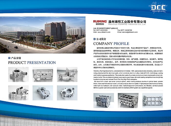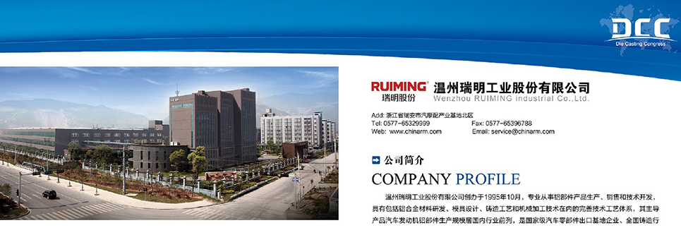 Wenzhou RUIMING Industrial Co. Ltd established in October, 1995, specializes in manufacturing, sales and technology development for aluminum parts, which concludes aluminum alloy material R&D, mold design, casting and machining process perfection. The production scale of our main product, aluminum engine parts is top in domestic market. We are national motorcar spare parts expert base, domestic casting comprehensive strength top hundred enterprise and national Torch Plan Key High-Tech enterprise.