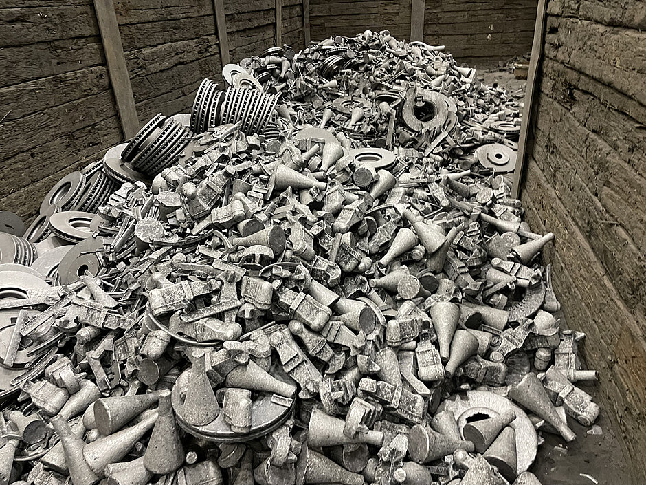 Gereinigte und zerkleinerte Rückstände, bereit zum Wiedereinschmelzen auf dem Schrottplatz