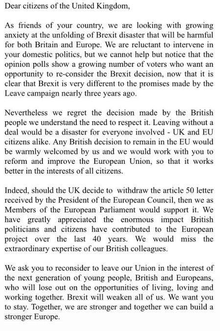 "Please don't go! Over 100 EU members of parliament are calling on the British people to reconsider the Brexit. Here, the letter:"
