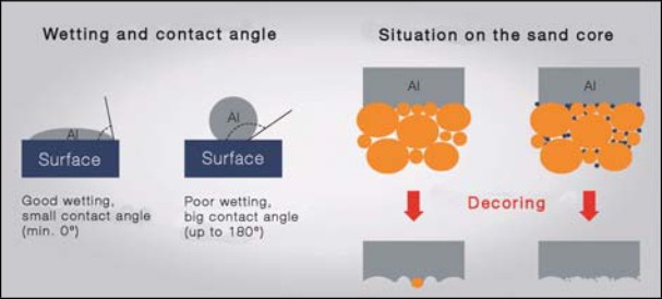 In Bild 3 ist dargestellt, wie man sich den Wirkmechanismus vorstellen kann, der zu diesem positivem Gussbild führt. In das Bindersystem wurden Komponenten eingebracht, die die Benetzung der Sandkernoberfläche durch das Metall verringern. Darüber hinaus wird der Kern durch Zugabe der neuen Inhaltsstoffe höher verdichtet, so dass das Eindringen des Metalls in die Lücken der Sandkernoberfläche erschwert wird. Beide Effekte zusammen führen zu einer deutlichen Reduzierung der am Gussstück sichtbaren Penetration.