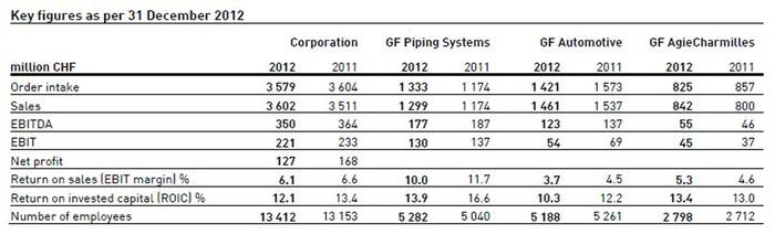 Despite a clear market slowdown in Europe, Georg Fischer generated a turnover of CHF 3.6 billion in 2012, 3 percent above the 2011 figure. On a like-for-like basis, sales reached the same level as in 2011. All three divisions both considerably increased their sales in Asia and the Americas and continued to generate value.