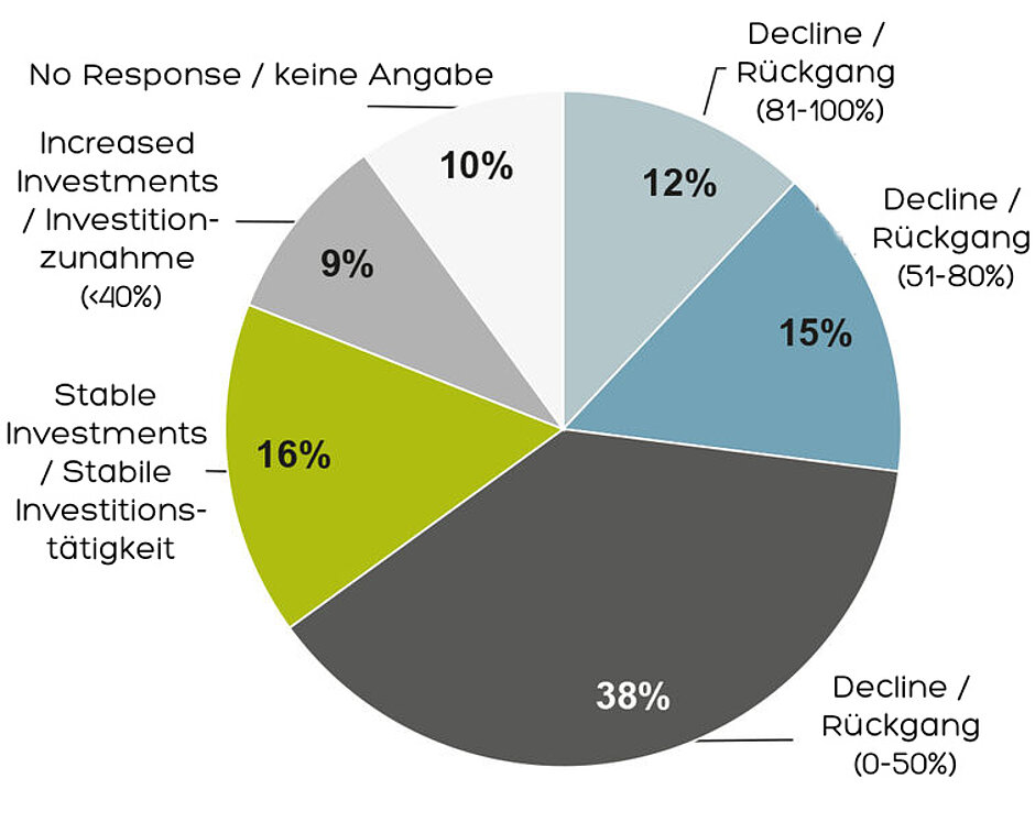 Während „Produktionsstopps“ (33 %, Vormonat 46 %) leicht abgenommen haben, könnte der „Personalabbau“ allmählich ein Thema für die Unternehmen werden. Hier stieg die Zustimmung zur Frage von 29 % auf 34 %. Dass dies allmählich in den Fokus rückt, überrascht angesichts der weiteren Einschätzung zum laufenden Jahr 2020 nicht. So erwartet lediglich eine Minderheit von 6 % der befragten Betriebe stabile bis leicht steigende Umsätze für das laufende Jahr, während 93 % Umsatzrückgänge erwarten, davon wiederum 92 % mehr als 10 % Rückgang.