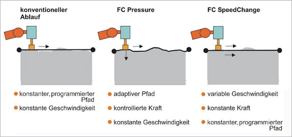 „FC SpeedChange“ sorgt als dritte Funktion mit dem Ändern der Roboterbahngeschwindigkeit für konstanten Materialabtrag während des Prozesses (Grafik 1, rechts). Treten zu hohe Bearbeitungswiderstände auf, reduziert die Software automatisch die Geschwindigkeit des Roboterarms und hält so die Bearbeitungskräfte konstant. Weiter verhindert der Roboter auf diese Weise Schäden am Werkstück oder Werkzeug, die durch zu hohe mechanische und thermische Beanspruchungen entstehen könnten. Sowohl die optimale Roboterarbeitsgeschwindigkeit als auch die reduzierten Schadensrisiken bzw. die erhöhte Prozesssicherheit steigern die Produktivität und Wirtschaftlichkeit des kompletten Bearbeitungsprozesses.