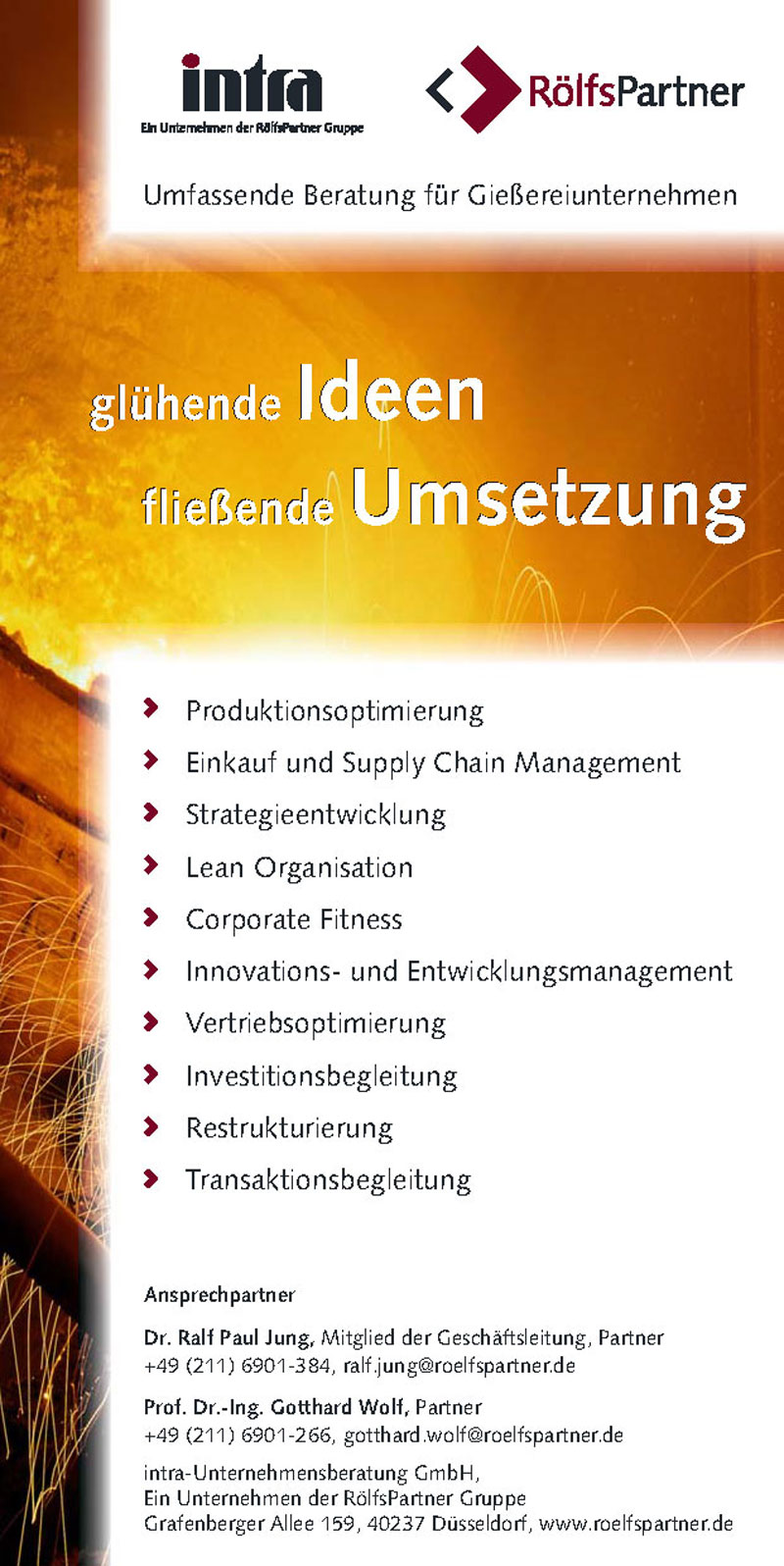 Gießereien stellen heute oft hochentwickelte Hightec-Produkte her und fördern so den Produktionsstandort Deutschland im internationalen Wettbewerb. Viele der auf dem Gießereitag gehaltenen Vorträge griffen dieses Thema auf. Für RölfsPartner steuerte Prof. Dr.-Ing. Gotthard Wolf einen Vortrag mit dem Titel „Industrialisierung von Handformereien: Möglichkeiten und Potentiale der Fließfertigung“ bei.