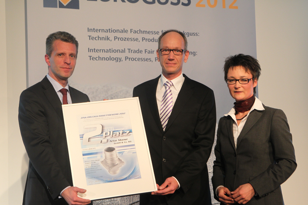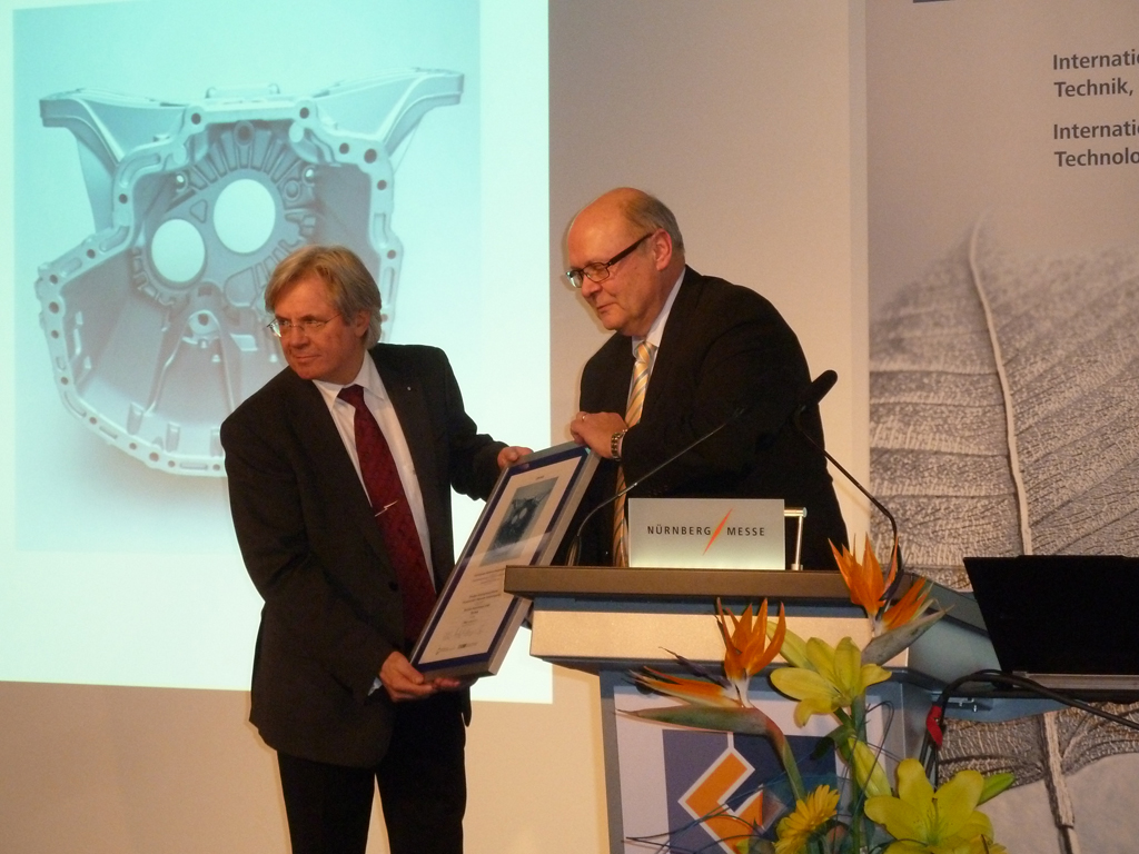 Es wurden zwei 1. Preise vergeben, da es sich bei beiden Gussteilen um eine innovative Bauteilgestaltung bei gleicher Technik handelt. Ein Teil ist extrem dünnwandig, filigran und leicht gestaltet, das andere Gussteil ist extrem dickwandig, aber dadurch von prädestinierter Festigkeit. Die Dickwandigkeit stellt hier unter Beweis, dass eigentlich dieses vermeintlich druckgussuntypische Konstruktionselement sicher beherrscht werden kann. An der Unterschiedlichkeit der beiden Siegerteile wird die Vielfalt in der Anwendbarkeit bei innovativen Druckgussteilen erkennbar.