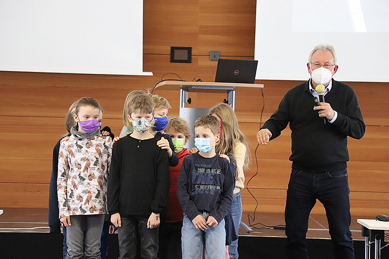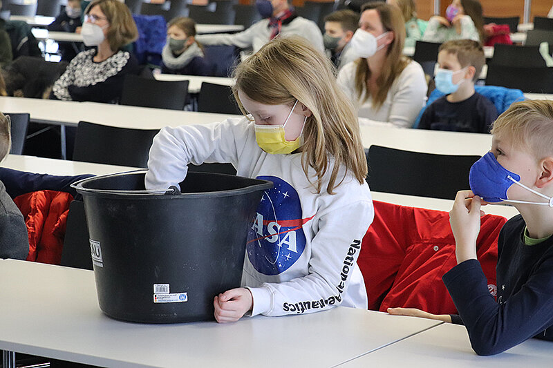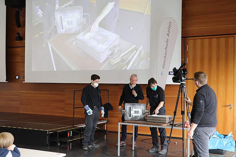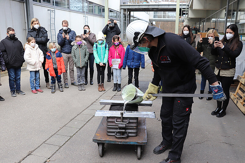 Ohne gegossene Schiffskurbelgehäuse, Windräder oder Druckguss für den Karosseriebau geht bei TESLA nichts. Während des Vortrags verkörperten die Kinder frei bewegliche Atome der flüssigen Schmelze. Wenn die Abkühlung beginnt, rücken die Kinder näher zusammen, die "Atome" nehmen weniger Platz ein und es kommt zu einer Schrumpfung. Gleichzeitig sandgegossen die Mitarbeiter ein Modell, das anschließend im Labor in Aluminium gegossen wurde. Schließlich lieferte eine Druckgussmaschine im Sekundentakt Flaschenöffner aus Zink.