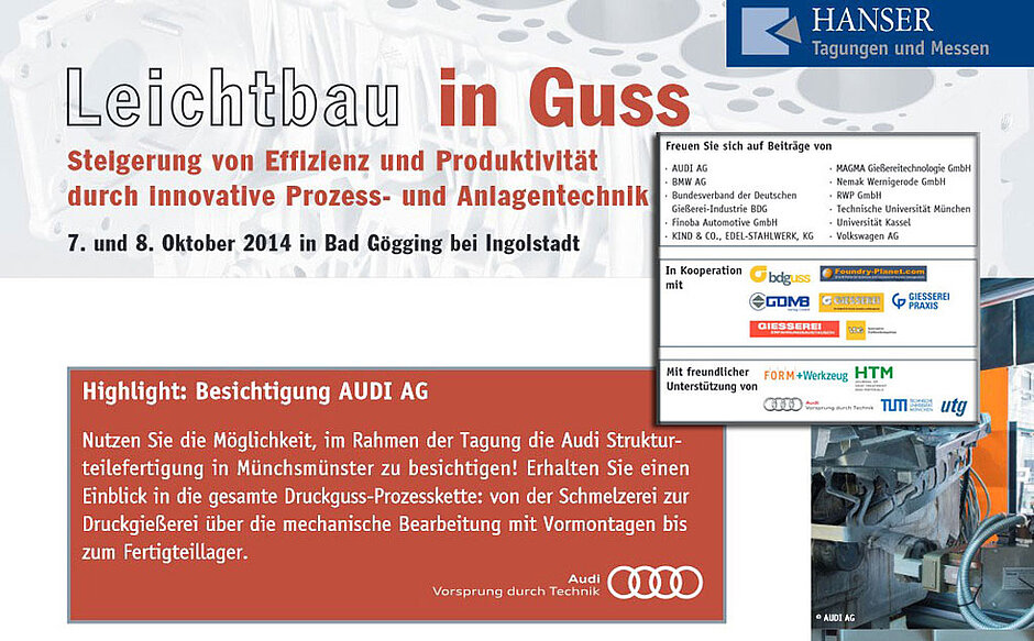 Bei der diesjährigen Fachtagung Leichtbau in Guss steht die innovative Prozess- und Anlagentechnik für alle Leichtmetallgießverfahren im Fokus. Nutzen Sie die Gelegenheit sich mit Experten der Branche bei Fachvorträge und Gesprächen auszutauschen. Als Highlight erwartet Sie die Besichtigung des 2013 neu eröffneten Strukturteilewerks der AUDI AG in Münchsmünster.