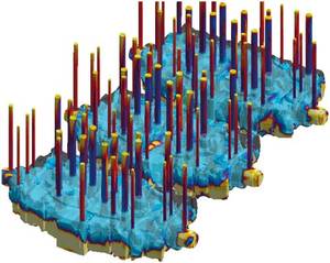 Simulation des Kernschießprozesses wird mit MAGMA C+M auch für komplexe Werkzeuge möglich, hier gleichzeitig für drei Kerne inklusive der Schießdüsen. |