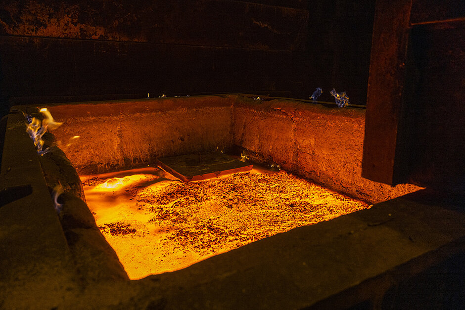 A foundryman removes layer of rice husk ash from the cast iron the ash is used the metal in one pot from cooling faster than the others. ©Jan Hosan o prevent