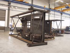 | Der Konstruktionsstrahler in der eigenen Fertigung von Rösler erweitert die Fertigungskapazität und steht für Strahlversuche zur Verfügung. | Dreidimensionale Schweißkonstruktionen wie Gehäuseteile mit 15 Tonnen Gewicht werden bearbeitet. |