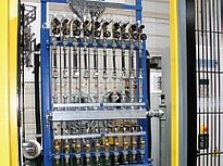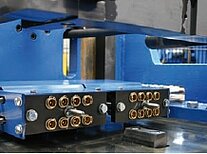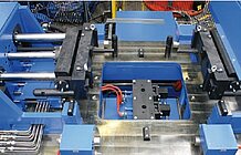 | Die maximale Ausbaustufe des Basiskonzeptes sind Tandem-Maschinen. Zwei Kokillen werden auf einer Maschine im Takt gefahren, was zu einer erhöhten Produktivität bei geringem Platz- und Personalbedarf führt. Eine verfahrbare Hydraulik bietet als mobiles Steuerungs- und Hydraulikaggregat Möglichkeiten zur Kontrolle der Öffnungs- und Schließbewegungen der Kokille an bis zu zwei Gießmaschinen. Bei allen Anlagen wird das auch bei anderen KURTZ-Maschinentypen bewährte Steuerungskonzept eingesetzt. Die Steuerung von Prozessablauf und Bewegung der Kernzüge erfolgt über das Maschinenprogramm. Eine Verknüpfung mit einer externen Steuerung zum Prozessmanagement einer gesamten Gießzelle bietet somit auch Einsatzmöglichkeiten in der Großserienfertigung. |