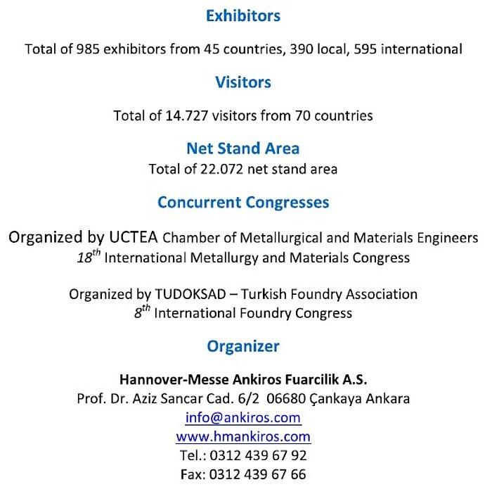 ANKIROS/ANNOFER/TURKCAST 2016 Fairs hosted two congresses in the same venue that addressed the recent scientific and technologic developments in the metallurgy industry. “18 th International Metallurgy and Materials Congress” organized by UCTEA Chamber of Metallurgical and Materials Engineers and “8 th International Foundry Congress” organized by TUDOKSADTurkish Foundry Association These congresses offered an opportunity to discuss new products and studies, latest research results and challenges of the metallurgy industry.