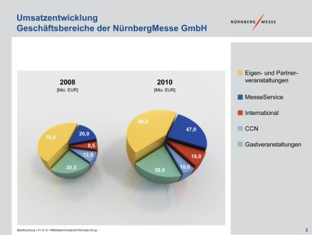 Da innerhalb der NürnbergMesse Group die ungeraden Jahre immer noch die schwächeren sind, geht Diederichs für das Jahr 2011 von einem Umsatz in der NürnbergMesse Group von über 160 Millionen Euro aus, nach 132 Millionen Euro im besser vergleichbaren Jahr 2009.