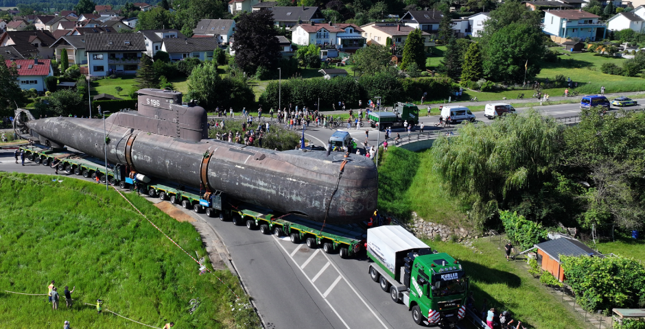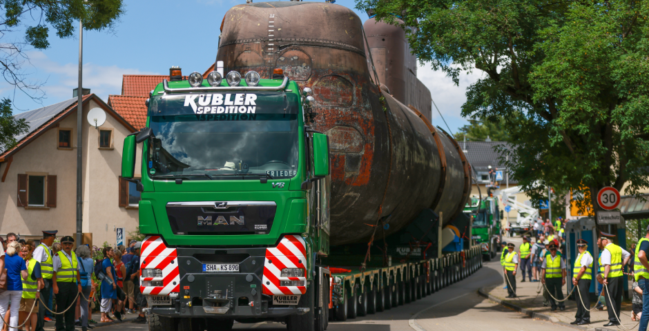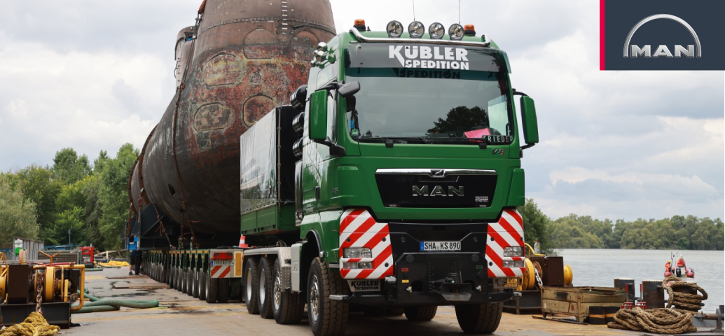 So einen Transport haben selbst die Profis von Kübler Schwertransporte nicht alle Tage. Rund 500 Tonnen (ca. 350 Tonnen U-Boot und ca. 150 Tonnen Tieflader) bewegen sie derzeit durch das Kraichgau im nördlichen Baden-Württemberg. Ihre Fracht: das U-Boot U 17, seit 2010 bei der Deutschen Marine außer Dienst und nun auf dem Weg zum Technikmuseum Sinsheim. Der fast 50 Meter lange Stahlkoloss thront auf einem Plattformwagen mit 30 Achsen, gezogen von einem MAN TGX 41.680 8x6. Kübler Schwertransporte ist ein langjähriger MAN-Kunde. „Wir setzen auf MAN, weil uns die Zuverlässigkeit der Fahrzeuge überzeugt hat“, sagt Niclas Grimm, Projektmanager bei der Spedition Kübler GmbH. „Für spezielle Transporte wie diesen haben wir einen MAN TGX 41.680 zu einem 8x6 umbauen lassen.“