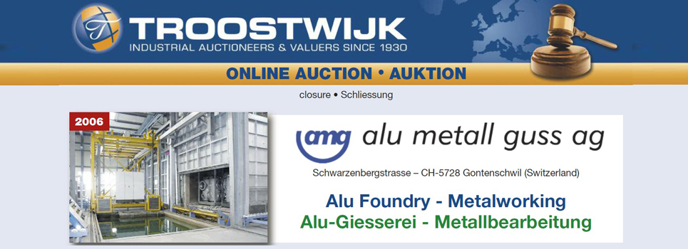 Due to closure of AMG-Alu Metall Guss AG in Gontenschwil, Switzerland, Troostwijk is selling the movable inventory of this plant in separate lots to the highest bidder. An online auction sale gives interested parties the opportunity to acquire the equipment in a transparent and fast way.