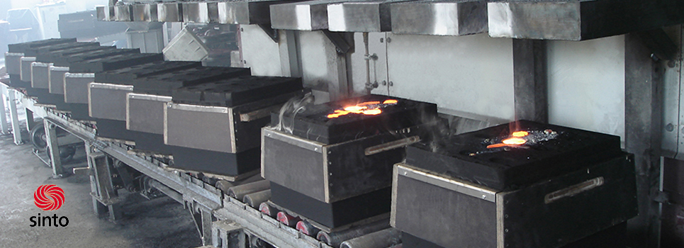 The target of the Heinrich Wagner Sinto engineers was to integrate modern moulding technology as simply as possible into the existing foundry process. The ideal solution for this requirement was the moulding machine FDNX. This moulding machine operates with the proven “Aeration” compaction process, i.e. the moulding sand is supplied into the moulding cavity by means of an air flow. The air escapes through slotted vents in the drag and cope. Hydraulic pressing then gives the mould cod its required stability. The hydraulic pressure is generated by a hydroconverter that is supported by a pressure amplifier. The result is mould cods with horizontal mould partition and a high mould quality.