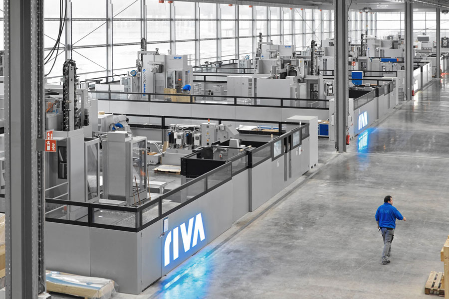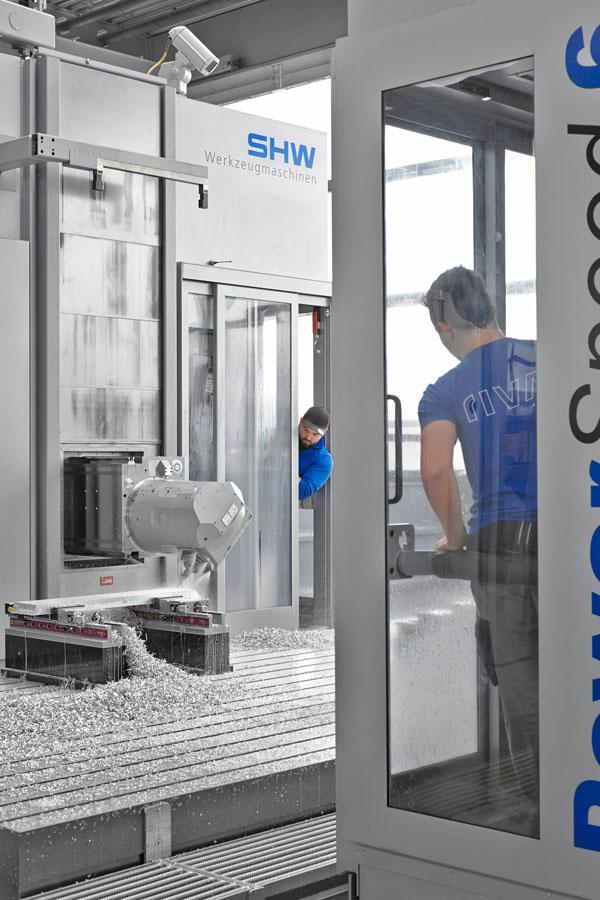 The erection of only German machinery in the production halls might seem surprising, but there is a simple reason, as Rasch explains: "Our customers expect 'Made in Germany' quality, which is why only the best technologies of the highest quality are used." This is something that impresses representatives of the customer when they personally visit on site. They occasionally come by to inspect the progress of the contract. This also explains why large blue or red RIVA lettering, signalling the operating status of the machines from a distance, are hung on the enclosures of SHW systems, as well as huge flat screens, which transmit the current machining processes through high-resolution cameras. "As a result, our customers thus have the opportunity to experience live machining processes without having to enter the machine shop." RIVA is very satisfied with the output of SHW machines.