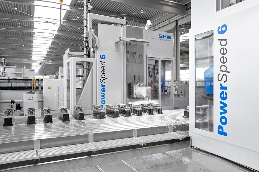 "We are producing elements made of metal for the buildings of the Holy Mosque in Mecca with high demands visually. They must be rendered durable in the harsh climatic conditions," explains Klaus Rasch, process engineer at RIVA GmbH Engineering in Backnang. To accomplish this, the dynamic, growing company has recently commissioned ten travelling column machines including a compact machine from SHW Werkzeugmaschinen, which in 2013 was the largest contract awarded to the established supplier from Aalen in the 650 years of company history. The delivery included four PowerSpeed 6 series travelling column machines with head changing system and with two columns for synchronous or parallel processing. "It is actually two machines that communicate with each other", explained Christian Hühn, Managing Director of SHW Werkzeugmaschinen. The parallel processing of large, hard-to-handle workpieces saves RIVA a lot of processing time and increases productivity and quality in a single setup. In addition, a PowerSpeed 5 and UniSpeed 6 from SHW WM have also been installed in the huge, newly built pristine halls, which glisten under their clean and open architecture and glass façade.