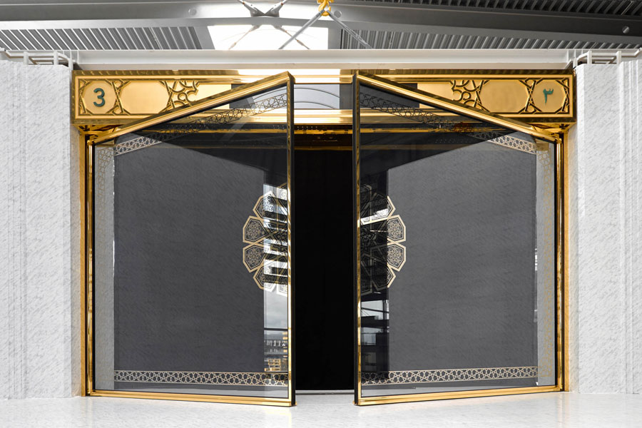 For the extensions of the Holy Mosque in Mecca, RIVA GmbH Engineering is manufacturing doors, gates and façade elements with integral insulating glass units up to 15 meters high as well as balustrades, ornaments and ceiling lighting systems. Although it all sounds somewhat mundane, on closer inspection it turns out to be a highly challenging task. The delivery includes double leaf swing doors up to 6.30 m wide and almost 7 m high, and four leaf doors made of glass up to 16 m wide, where each leaf has a glass element weighing nearly 4 tonnes circumferentially mounted in massive frame profiles made of duplex steel. The doors, weighing a total of 100 tonnes, have to work absolutely smoothly in the harsh climatic conditions of the desert with sand and dust and temperatures below 0° C at night and up to 50° C during the day. Ultimately, they should direct the flow of pilgrims and in case of danger quickly close or open, in order to effectively prevent cases of panic.