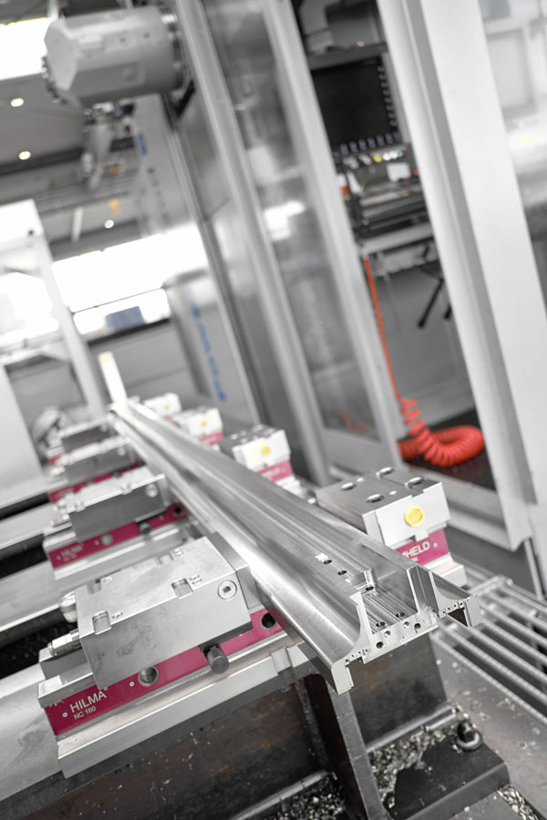 With a traverse speed of 30,000 mm/min., the double columns of the PowerSpeed 6 travel along the 14,000 mm long traverse distance quickly to any part along the 12,000 mm length of the workpieces. The headstock moves vertically in the Z direction up to a height of 2100 mm and horizontally in the Y direction up to 1500 mm in the customer specified rotated coordinate system. For over 50 years, the core element of the SHW machines remains the compact and powerful automatic universal milling head in an orthogonal design. Using the articulated milling head more than 216,000 calculated positions of the workpiece can be approached quickly and with exact precision, as a result of the 180° rotation range of the A-axis and 360° of the continuously variable C-axis, as used in versions with the head changing system. The compact head pivots automatically to any desired position. "This provides exactly the flexibility and high machine availability of over 90 percent, which we need for the frequently very short-term production schedules", remarks Rasch.