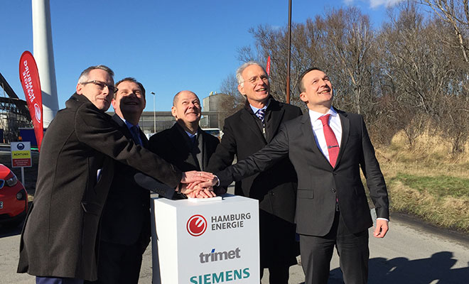 On the premises of the TRIMET aluminum smelter in the port of Hamburg, the municipal energy supplier Hamburg Energie has put three wind turbines into operation. Hamburg’s First Mayor, Olaf Scholz, called the facility a further beacon for Hamburg, Germany’s wind capital: “The three large wind turbines in front of an impressive harbor backdrop clearly show that commercial premises, more than ever before, can contribute to the production of energy. This project, the installation of a wind farm in the heavily-used commercial section of the port, is unique in Germany.”