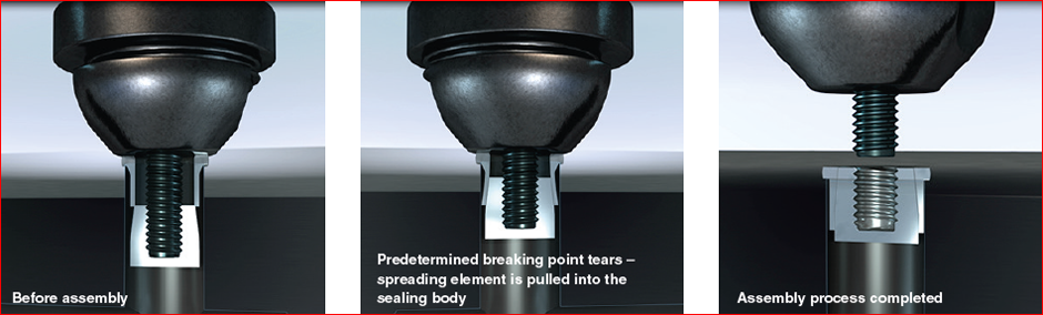 This objective had to be achieved with different materials – primarily steel, stainless steel and aluminum. A radical idea eventually paved the way: The design engineers integrated the principle of a blind rivet into that of a closed blind rivet nut. The result is a single-piece, weight-optimized closing and sealing element that is suitable for hole diameters from 8 to 24 mm and can accommodate temperature fluctuations between -40 °C and +200 °C. The right material pairing is a crucial aspect here: The component and the b&m-KL Plug have to have the same linear expansion coefficients.