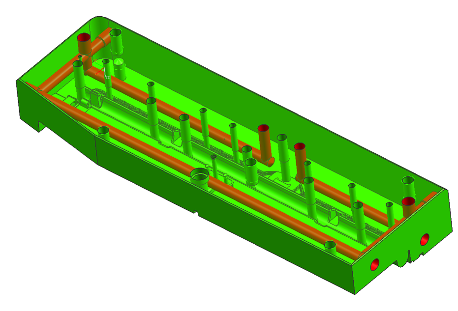 A look at the production of a cable mount ordered by a car manufacturer illustrates what this means in practical application. The focus is on the mold consisting of two halves – a cube weighing 900 kg in total, with a length of 1000 mm and a width and depth of each 500 mm. “It is made primarily of tool steel,” explains Mark Joos, “whereby the areas that produce the actual shape and come into contact with the plastic are made of hardened tool steel. As we also process glass-fiber reinforced plastics, the mold contours have to be hardened and in some cases even coated – soft steel would wear too quickly.”