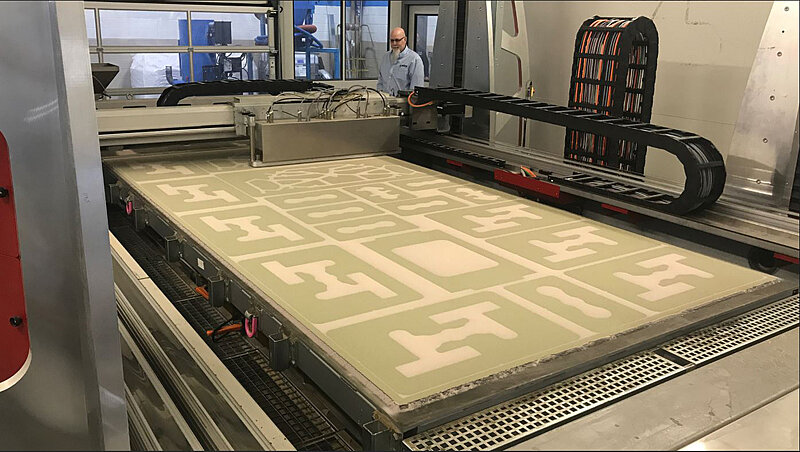 Mit einem Bauraum von 4 x 2 x 1 Meter ist der VX4000 von voxeljet einer der weltweit größten 3D-Sanddrucker für Metallgussanwendungen und kann zur Herstellung einzelner, sehr großer Sandformen oder mehrerer kleinerer Formen in Produktionsqualität eingesetzt werden .
