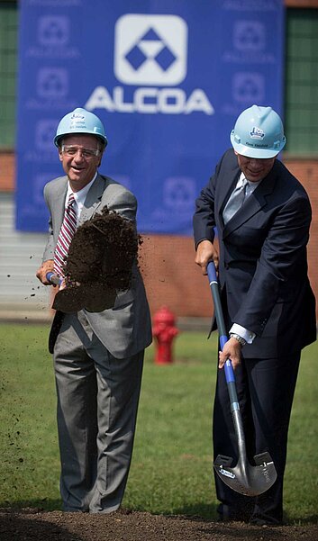 Gov. Bill Haslam, left, and Alcoa Inc. CEO Klaus Kleinfeld take part in a groundbreaking for a $275 million expansion of the Alcoa Inc. rolling mill to produce automotive sheet aluminum on Thursday, Aug. 29, 2013, in Alcoa. (Paul Efird/News Sentinel)