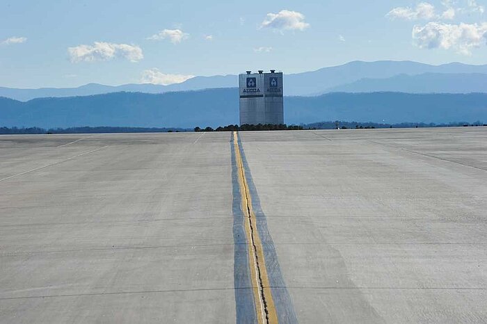 The ALCOA plant tower is pictured with a portion of the Metropolitan Knoxville Airport Authority's runway and taxiway construction project Thursday, Dec. 29, 2016, at McGhee Tyson Airport. A nearly 40-year-old runway is being removed and reconstructed in a multi-year project.