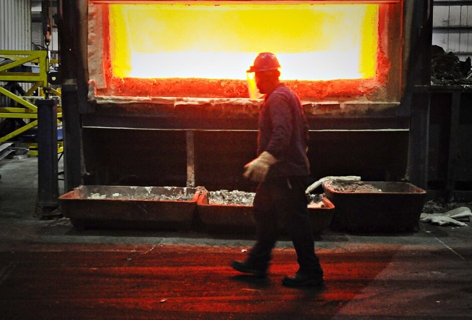 Carlos Hernandez of Bowling Green walks in front of a high heat furnace used to melt aluminum on Monday March 26, 2012 at Trace Die Cast. (Photo by Miranda Pederson/Daily News)