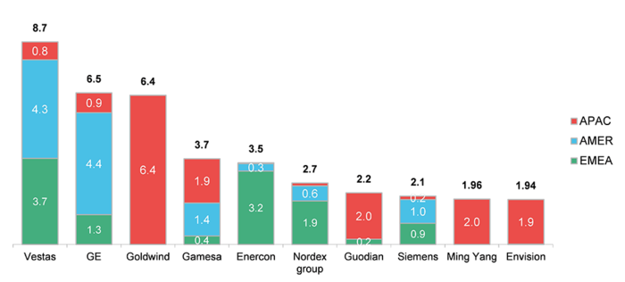 Top 10 onshore turbine manufacturers, 2016 (GW)
