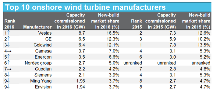 Nordex group returned to the top 10 in sixth place, after its merger with Acciona Windpower last year. China’s Guodian United Power remained in seventh place, ahead of Siemens. The latter fell four places in the onshore ranking compared to 2015. Chinese firms Ming Yang and Envision tied for ninth place, with the difference between the two manufacturers too close to call.