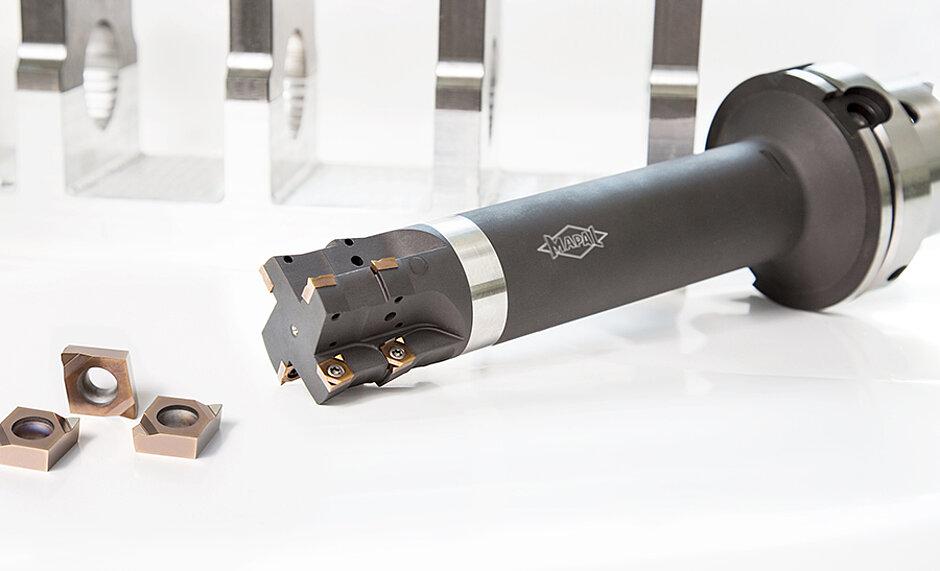 Je nach Anwendung kann zwischen standardmäßig verfügbaren ISO-Wendeschneidplatten gewählt werden. MAPAL bietet jeweils vier Geometrien für die Kombination Aluminium-Guss sowie für Aluminium-Sinterstahl. Darüber hinaus sind Sonderwendeschneidplatten mit dem neuen Schneidstoff verfügbar. Die Ergebnisse in der Praxis mit dem neuen Schneidstoff überzeugen. Wo bisher lediglich zehn Lagergassenbohrungen aus der Kombination von Sinterstahl und Aluminium mit einer Schneide bearbeitet wurden, sind es mit dem neuen Schneidstoff beeindruckende 700 Bohrungen.