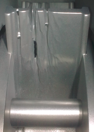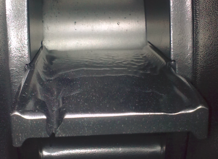 By removing the waste particles, the operating mix now has a higher efficiency, since each abrasive particle transfers sufficient energy for the cleaning process. This change has a direct effect on the wear of the throwing blades. Sand particles in the working mix often destroy the blades on one side very fast (Images 3 to 5). A too fine, scale-containing operating mix also increases the wear. When one evaluates the blasting process costs, it seems that the abrasive media costs in a forge application is approximately 20 percent of the blasting process costs, in a foundry, the proportion of abrasive is about 30 percent. The maximum possible savings is with the other cost factors such as energy, wear and spare parts, waste and personnel costs.