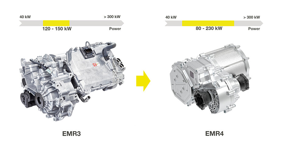 Der EMR4 (Electronics Motor Reducer) bietet eine hohe Leistungsdichte und kompakte Abmessungen bei geringem Gewicht. Die umfangreiche Antriebsplattform ist für Leistungsanforderungen von 80 kW bis zu 230 kW ausgelegt. Dank der Entwicklungs- und Industrialisierungserfahrung mit dem erfolgreichen EMR3 und Vorgängermodellen hat die neue Plattform ein sehr hohes Integrationsniveau, sie ist modularisiert, skalierbar und standardisiert. Damit können Fahrzeughersteller weltweit in einem Modell unterschiedliche Leistungsstufen des Antriebs anbieten, ohne dabei Schnittstellen oder Befestigungspunkte anfassen zu müssen. Verglichen mit dem EMR 3, der in mehrfach ausgezeichneten Fahrzeugen zum Einsatz kommt ist der EMR4 noch energieeffizienter. Er wiegt bei gleicher Leistung 25 Prozent weniger und ist gleichzeitig kostenoptimiert.