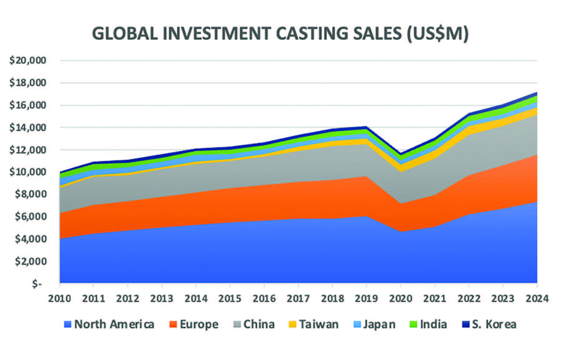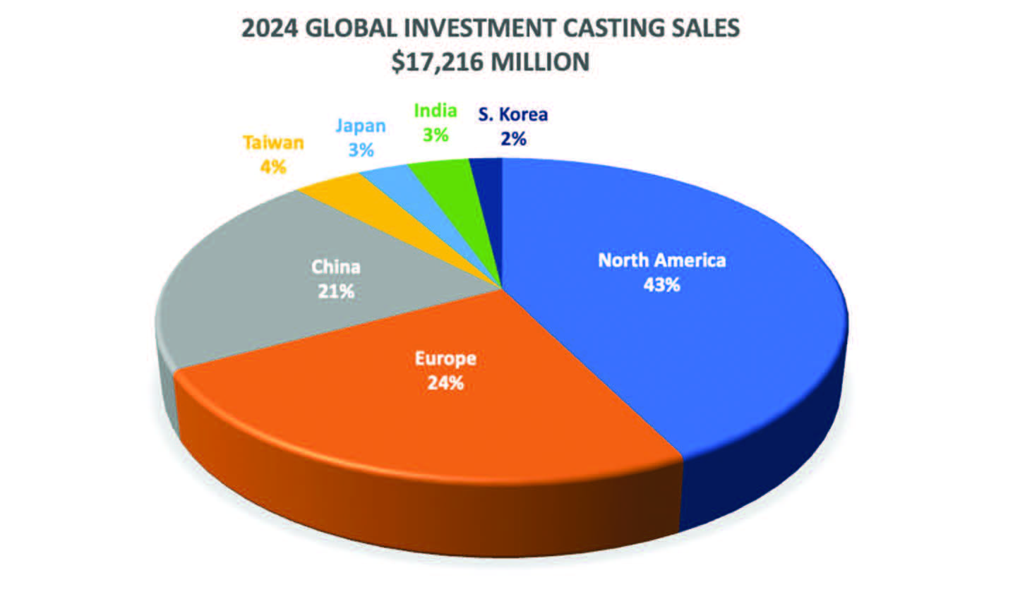China: 3,58 Milliarden US-Dollar, wobei 56 % des Umsatzes auf Gussteile für die allgemeine Industrie entfielen, darunter medizinische Geräte, Öl und Gas sowie militärische Komponenten außerhalb der Luft- und Raumfahrt. Zusammen trugen diese drei Regionen fast das gesamte weltweite Nettowachstum in der Feingussindustrie bei. In anderen Teilen Asiens – darunter Japan, Indien, Taiwan und Südkorea – war das Wachstum moderat und konzentrierte sich auf Nischenbereiche. Es wird jedoch erwartet, dass die gesamte Region Asien-Pazifik, angeführt von China und Indien, langfristig ein Wachstumsmotor sein wird. Die beschleunigte Industrialisierung, die Expansion der heimischen Fertigung und steigende Investitionen in die Verteidigungs- und Energieinfrastruktur versprechen der Region eine anhaltende Dynamik im Bereich Feinguss.