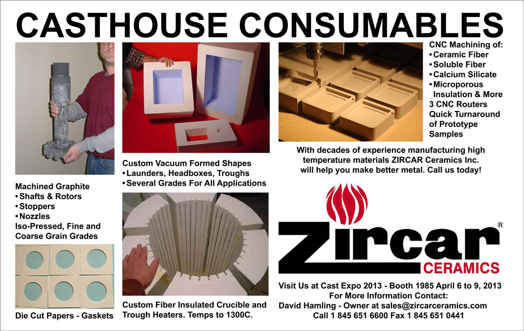 ZIRCAR Ceramics, Inc. is a US based manufacturer and international marketer of a wide range of engineered high temperature materials and products bringing value to the metal casting operations it serves. Presented at its booth at Cast Expo 2013 will be High quality casthouse consumable products including: vacuum formed ceramic fiber boards and shapes for applications such as troughs, launders, ladles, filter boxes and furnace insulation; ceramic fiber paper and blankets in roll and die cut form for use as gaskets and mold wraps; machined graphite in several densities and grain sizes for use as degasser impellers, flow control valve parts and molds; vacuum formed ceramic fiber and dense refractory supported heaters for use as primary heat in electrically heated crucible and dosing furnace applications. Boron nitride, colloidal graphite and other refractory coatings combined with a machine shop equipped with 4 CNC milling systems for precision manufacturing of custom calcium silicate, microporous silica and soluble fiber products give ZIRCAR Ceramics the ability to help you make better metal.