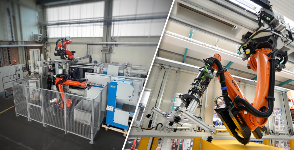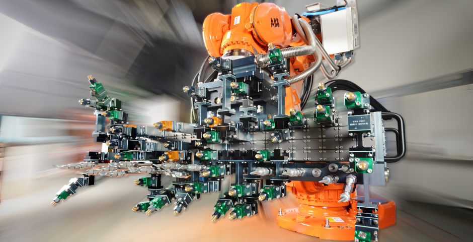 The high weight of the engine blocks posed a particularly difficult challenge for the robotic handling of the work pieces. A manipulator, able to carry up to 700 kg, had to be found. In addition, it must rotate the work pieces in front of the blast machine and tilt them by 360 degrees to remove residual blast media trapped inside of the engine blocks. For this purpose, the robot is equipped with a “lightweight” gripping system that allows safe pickup and handling of the different engine block types.
